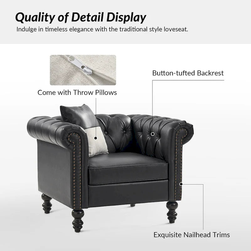 Thistraditional style armchairoffers both elegance and practicality. Upholstered inPU leather, it provides awaterproof and easy-to-cleansurface, ensuring durability and convenience. Itsclassic rolled armsand intricatenailhead detailsexude vintage charm, while the sturdy and durablegourd-shaped solid wood legsprovide reliable support. Additionally, this armchair comes with acomplementary color throw pillow, adding a touch of customization and comfort to your seating experience. Whether you're lounging with a book or entertaining guests, this armchair with abutton-tufted backrestcombines style and functionality seamlessly, making it a stylish addition to your living space.