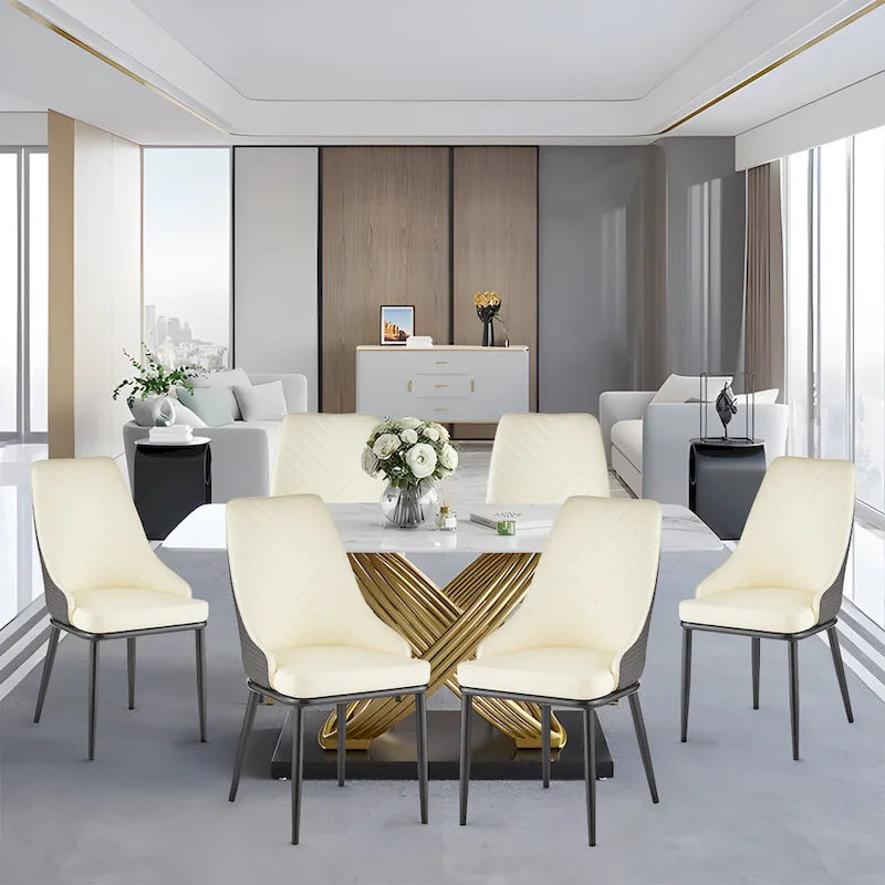 Add contemporary appeal to your dining room, living area or office reception with the accent dining chair. Crafted from one-piece solid metal frame and wrapped with high quality faux leather upholstery, the side chair features v-shape stitching lines on the front and delicate woven pattern on the back for an on-trend and design-sense look. Strong to accommodate up to 300 pounds for sturdiness and durability. This set requires partial but easy assembly, just connect the base with seat with 6 screws. A practical and artistic piece for home decor.