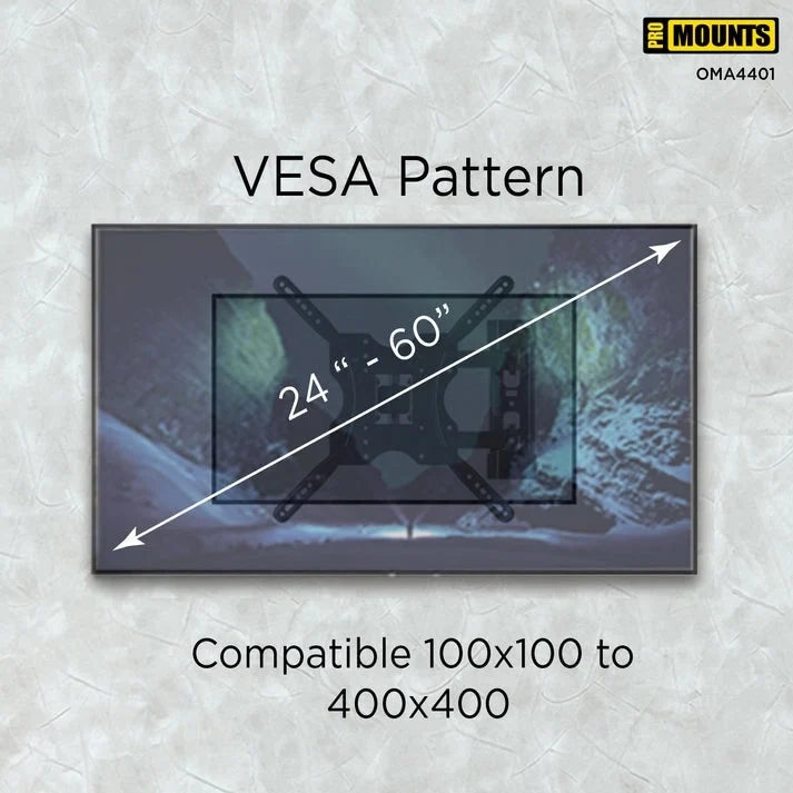 The full motion TV wall mount uses a full metal construction with thicker steel than other wall mounts on the market, so you can have full confidence in your purchase. Safely mount TVs from 24 inches to 60 inches, weighing up to 88 lbs, to keep them out of reach from pets and young children and eliminate the risk of your TV tipping.
