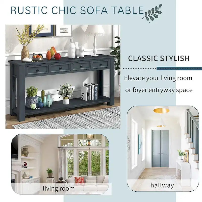 Elevate your living room or entryway with our Rustic Chic Console Table. Crafted from solid wood and MDF, this table offers both durability and style. Its ample storage space includes four drawers and a fixed lower shelf, perfect for organizing essentials. With its clean lines and elegant legs, this console table exudes a high-end, fashionable look. Easy to assemble with included tools and instructions. Add a touch of rustic charm to your home with this versatile and functional piece.